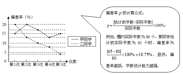 为了了解甲、乙两同学对“字的个数”的估计能力,现场对他们进行了5次测试,测试方法是:拿出一张报纸,随意用笔画一个圈,让他们看了一眼后迅速说出圈内有多少个汉字,但不同的是:甲同学每次估计完字数后不告诉他圈内的实际字数,乙同学每次估计完字数后告诉他圈内的实际字数.根据甲、乙两同学5次估计情况可绘制统计图如下:
