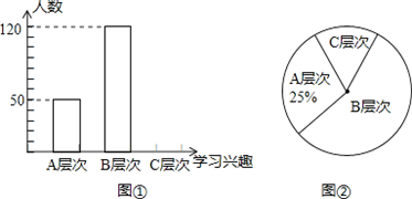 学生的学习兴趣如何是每位教师非常关注的问题.为此,某校教师对该校部分学生的学习兴趣进行了一次抽样调查(把学生的学习兴趣分为三个层次,A层次:很感兴趣;B层次:较感兴趣;C层次:不感兴趣);并将调查结果绘制成了图①和图②的统计图(不完整).请你根据图中提供的信息,解答下列问题:![]()