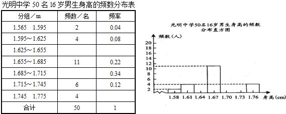 23、光明中学为了了解男生的身高情况,抽测了全校50名16岁男生的身高,将数据分成7组,列出了相应的频数分布表(部分未列出)如下: