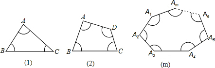 如图中(1)、(2)、…(m)分别是边长均大于2的三角形、四边形、…、凸n边形.分别以它们的各顶点为圆心,以1为半径画弧与两邻边相交,得到3条弧、4条弧…、n条弧.