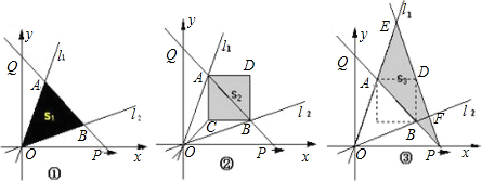 x.点P从原点O出发沿x轴正方向以每秒1个单位长度的速度运动.直线PQ交y轴正半轴于点Q,且分别交l1、l2于点A、B.设点P的运动时间为t秒时,直线PQ的解析式为y=-x+t.△AOB的面积为Sl(如图①).以AB为对角线作正方形ACBD,其面积为S2(如图②).连接PD并延长,交l1于点E,交l2于点F.设△PEA的面积为S3;(如图③)