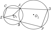 已知:如图,⊙O1和⊙O2相交于A、B两点,经过A的直线CD与⊙O1交于点C、与⊙O2交于点D,经过点B的直线EF与⊙O1交于点E、与⊙O2交于点F,连接CE、DF.若∠AO1E=100°,则∠D的度数为________度.