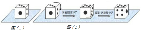 16、将正方体骰子放置于水平桌面上,如图(1).在图(2)中,将骰子向右翻滚90°,然后在桌面上按逆时针方向旋转90°.则骰子中各相对面上的点数分别为