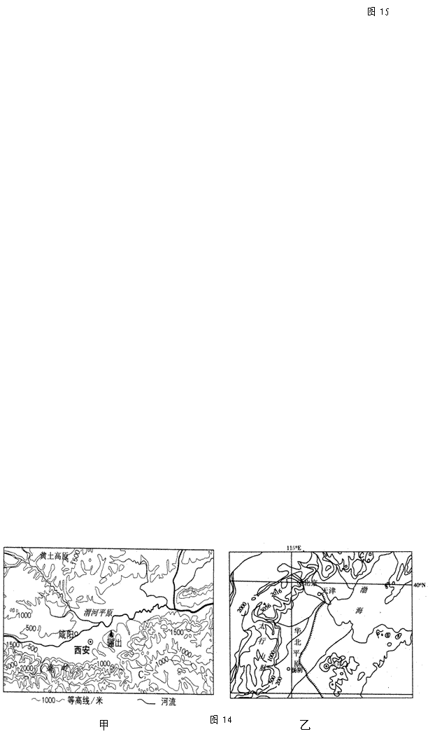(2)描述图14乙图中40ºN以南地区的地形特征。(6分)