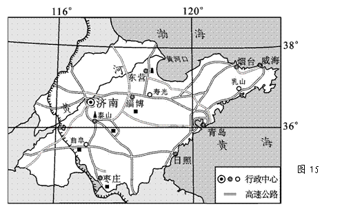 2009年10月16-28日山东省成功主办了第十一届全运会。全运会全面展示了山东省的经济实力。近年来山东省地区生产总值稳居全国第二。读下图(图15)和表2回答: