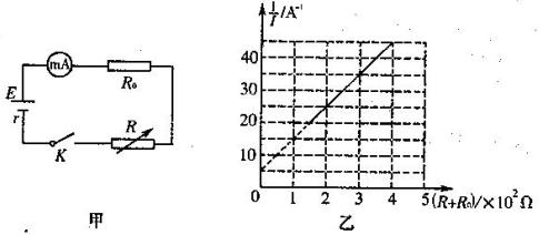 (2)该同学接入符合要求的RO后,闭合开关K,调整电阻箱的阻值,读取电流表的示数,记录多组数据,作出了图乙所示的图线,则根据该同学作出的图线可求得该电池的电动势E=_________V,内阻r==_________![]()