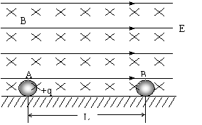 25、(20分)在光滑绝缘水平面的上方,有一足够大的、由电场强度为E的匀强电场和磁感应强度为B的匀强磁场构成的正交电磁场区域,其方向如图所示。在水平面上沿电场线方向放有两个静止的小球A和B(均可看做质点),两小球的质量均为m ,A球带电荷量+q ,B球不带电,开始时两球相距L,现释放两球,A球开始运动,当A、B碰撞时,A、B两球的总动能无损失,且A、B两球间无电荷转移,不考虑两球间的万有引力和空气阻力,问: