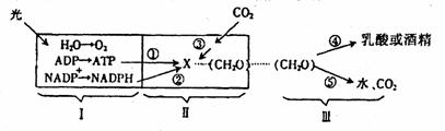 (1)II、III代表植物体内的重要生理过程,分别是: 、 ,③过程进行的场所是 。在I生理作用过程中,吸收光能的物质分布在叶绿体的 上,用化学反应式表示I阶段中NADP+→NADPH的变化: ;(6分)