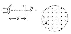 (19分)如图所示,涂有特殊材料的阴极K,在灯丝加热时会逸出电子,电子的初速度可视为零,质量为m、电量为e.逸出的电子经过加速电压为U的电场加速后,射入与磁场方向垂直的半径为R的圆形匀强磁场区域.已知磁场的磁感强度为B,方向垂直纸面向里,电子在磁场中运动的轨道半径大于R。试求: