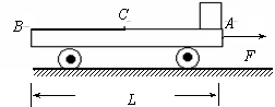 (20分)如图所示,光滑水平地面上停着一辆平板车,其质量为2m,长为L,车右端(A点)有一块静止的质量为m的小金属块.金属块与车间有摩擦,与中点C为界, AC段与CB段动摩擦因数不同.现给车施加一个向右的水平恒力,使车向右运动,同时金属块在车上开始滑动,当金属块滑到中点C时,即撤去这个力.已知撤去力的瞬间,金属块的速度为v0,车的速度为2v0,最后金属块恰停在车的左端(B点)。求: