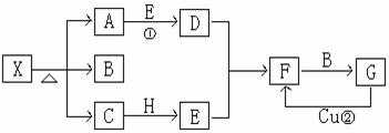 25.(13分)下图表示了中学化学中几种常见物质的转化关系,图中省略了部分产物和反应条件,已知常温下,B、G是液体,X、H是固体且两者化学式量相差1,其余物质均为气体,且E 是一种常见的气体单质,F是红棕色气体。