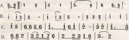2.《黄河大合唱》是一部史诗性的大型声乐套曲,气势宏伟磅礴,音调清新、朴实优美,具有鲜明的民族风格,强烈地反映了时代精神。下列与第七乐章《保卫黄河》中的歌词“风在吼,马在叫,黄河在咆哮”相对应的曲谱是