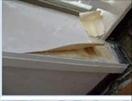 张明亮家桌子表面的装饰面板出现了部分脱落和拱起(如图所示)。他采用下面哪种连接方式进行修补比较合理