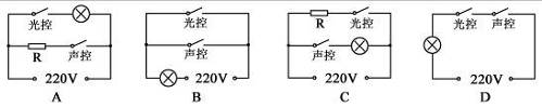 (3) 小明是一位爱动脑筋的同学,他想:路灯改装还有没有更好的方法呢?通过查资料知道有一种“光控开关”--天黑时自动闭合,天亮时自动断开;还有一种“声控开关”--有声音时自动闭合,一分钟后,若再无声音就自动断开。小明利用这两种开关设计了一个“聪明”的电路:白天路灯不亮,晚上有人走动发出声音时,路灯自动亮起来。请判断小明设计的电路图是 。