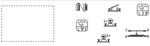 (2006年泰安市非课改区)在下图中,要求L1、 L2并联,用电流表测量干路中的电流(约为0.4A),电压表测量灯泡L1的电压,变阻器调节L2的亮度,开关控制整个电路,将符合要求的电路图画在虚线框内,并用笔画线表示导线将右下图中各个元件连接起来。