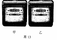 (2006年江西省)“五·一”节期间,小段同学和爸爸、妈妈一起到外地游玩了两天整,出门前,他们关闭了家中其他用电器,只有一台额定功率为0.2 KW的电冰箱在间歇工作(只考虑压缩机的工作).为了了解电冰箱的工作情况,小段在出门前、后注意观察了电能表的示数,如图13甲、乙所示,求: