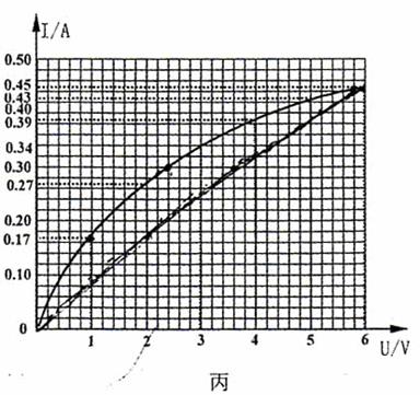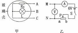 (2006年宁波市)某科学兴趣小组的同学在实验室发现一个有趣的元件(如图甲所示):透明玻璃壳内有一个标有“0.6V 3W”字样的小灯泡L(阻值不变)和一个由一种特殊金属丝制成的导体R0,A,B,C是其外露的三个接线柱。为进一步了解导体R0的某些特征,他们使用了如图乙所示电源电压恒为6伏的实验装置:把导线M,N分别与A,C接线柱相连,闭合开关S,移动滑动变阻器的滑片P,测得了一组电流表和电压表的读数,并绘制成图丙所示曲线。