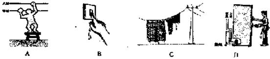 A、发现有人触电时,立即切断电源 B、在有绝缘外皮的通电导线上搭晾衣服