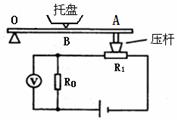 为显示重力大小的仪表(实质是一个量程为0-3V的电压表)。已知OB:OA=1:2,R0=100Ω,电源电压恒为3V(忽略托盘、杠杆及压杆的重力)。
