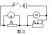 36.小明同学将滑动变阻器R1和定值电阻R2串联在电源电压为6V的电源两端,如图21所示,小明多次调节滑动变阻器的滑片改变R1两端的电压U1,记录电压表V2的读数U2,得到如表4所示的实验数据,请根据表中数据,归纳出U2和U1的关系是 。