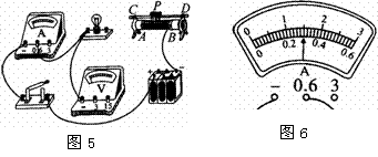 (2)他连好电路,闭合开关后发现无论怎样移动滑片P,灯都不亮,电流表示数为0,电压表示数为6V,则电路故障可能是 ;排除故障后,调节滑动变阻器直到电压表示数为3.8V,观察到电流表示数如图6所示,则小灯泡的额定功率为 W。