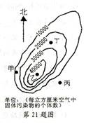 21.右图是某市夏季空气污染浓度的等值线图(类似于地形中的等高线)。据图可知该区域中主要污染源位置在 ▲ 区。