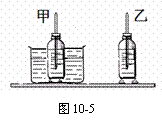小明注意到妈妈是把饭菜放在空气中冷却的,而厨房中适合用来冷却的另一种物质就是水。水和空气哪个的导热性能好呢?为此小明用两个相同的牛奶瓶,都装入热牛奶,一个放在温度与室温相同的水中,另一个就放在空气中,为了尽量减少其他因素的影响,他把两个瓶都用木块垫起来,放在同一个桌面上,如图10-5所示。实验时他每隔一定的时间记录一次甲、乙两温度计的示数,得到的数据如下表: