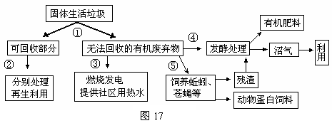 (3)垃圾实在是被人们放错了地方的资源,实现垃圾的“减量化、资源化和无害化”是绿色城市的重要标志之一。图16是垃圾资源化、无害处理的一种方案,此方案中①、②过程需要每一位市民的参与,我们参与的行动方式是 。④、⑤过程利用的生物隶属于生态系统的何种成分? 。从对资源的充分利用角度分析,④、⑤途径比③途径的优点是 。