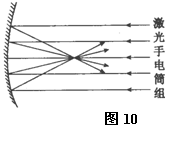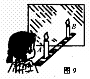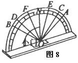 如图8所示为研究光的反射规律的实验装置,其中O点为入射点,ON为法线,面板上每一格对应的角度均为10°。实验时,当入射光线为AO时,反射光线为OB;当入射光线为CO时.反射光线为OD;当入射光线为EO时,反射光线为OF。请你完成以下表格的填写。