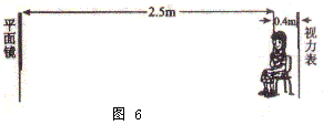 21. 检查视力的时候,视力表放在被测者头部的后上方,让被测者识别对面墙上镜子里的像(图6),视力表在镜中的像与被测者相距_____________m,与不用平面镜的方法相比,这样做的好处是____________________________________________________。