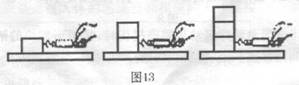 (2)为验证上述结论是否正确,小明按图13所示的方法,在较粗糙的水平地面上又进行了一次实验,记下了上列右表中的数据。