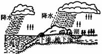 右图是大自然中水循环现象的示意图.江、河、湖、海以及大地表面层中的水不断 变成水蒸气,这一过程要吸热.当含有很多水蒸气的空气升入高空时,水蒸气的温度降低凝成小水滴或小冰晶,这就形成了云,云是水蒸气液化或