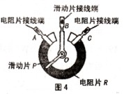 10.电位器和滑动变阻器都是变阻器,它们的原理都是通过改变接入电路中导体的长度而改变电阻的.图4是某电位器的结构示意图,电阻片R的两端分别与接线端A、C相连,滑动片P的一端通过转轴O与接线端B相连,另一端与电阻片R接触良好,并能绕转轴O在电阻片R上滑动.已知电阻片R的总电阻为10,将电位器A、B两个接线柱分别接在电压为2.4V的电源两端.当滑动片P位于图4所示的位置时,接线端B、C间的电阻为6.下列说法正确的是