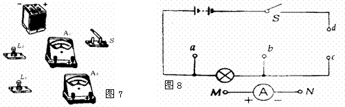 16. 如图8所示,a、b、c、d为电路中的四个接线点,若用电流表测量通过小灯泡的电流强度,则电流表的M、N接线柱与电路中各接线点的连接关系为( )