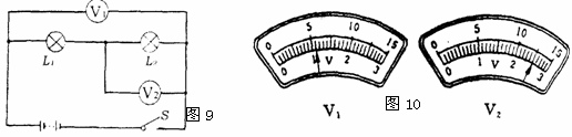 18. 如图9所示的电路中,电压表所用的量程不明,当电路闭合后,V1和V2的示数分别如图10所示。则V1用的量程是 V,V2用的量程是 V,小灯泡L1上的电压U1= 。