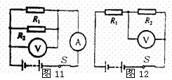 19. 将 R1、R2两个电阻按如图11、12所示的两种方法先后连接到电压不变的电源上图11中电压表的示数是6V,电流表的示数是0.3A;图12中电压表的示数是4V,电阻R1= Ω。