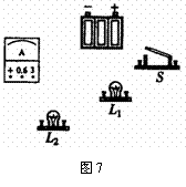 10.用图7所示的器材,按下面要求在虚框内画出电路图,并用笔画线连接电路.要求:L1和L2并联,用电流表测出L2中的电流(约1.2A),S作总开关.