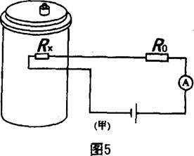 毒。图5为自动测定锅内温度的电路原理图,其中R0为定值电阻,A为温度指示表(实质是一只电流表),Rx为热敏电阻(其电阻值随锅内温度的变化而变化)。热敏电阻的阻值与温度的对应关系如表4所示,电源两端的电压不变。