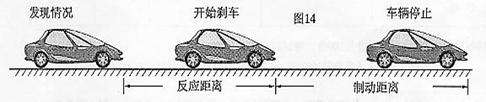 现代社会汽车大量增加,发生交通事故的一个重要原因是遇到意外情况是不能立即停止。司机从看到情况到肌肉动作操纵制动器来刹车需要一段时间,这段时间叫反应时间;在这段时间内汽车要保持原速前进一段距离,叫反应距离。从操纵制动器刹车,到车停下来,汽车又要前进一段距离,这段距离叫制动距离(如图14所示)。表格是一个机警的司机驾驶一辆保养得很好的汽车在干燥的水平公路以上不同的速度行驶时,测得的反应距离和制动距离。