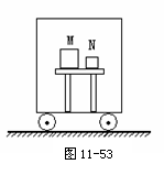 4.如图11-53所示,车厢在水平面上作匀速直线运动,在车厢内固定的光滑桌面上放置质量分别为M和N的两个物体,M>N.不计其他阻力,当车突然停止时,两个物体在离开桌面前 ( )