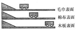 如下图所示,在水平桌面上铺粗糙程度不同的物体,让小车自斜面顶端同一高度从静止开始滑下。小车在不同表面运动的距离见下表。通过探究,我们可以反驳如下说法中的哪一条?