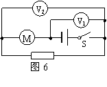 25.如图6是一个玩具汽车上的控制电路,小明对其进行测量和研究发现:电动机的线圈电阻为1Ω,保护电阻R为4Ω,当闭合开关S后,两电压表的示数分别为6V和2V,则电路中的电流为 A,电动机的功率为 W。