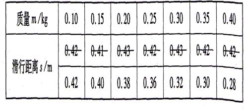 (2)小敏认为:木块及钩码的质量越大,对水平面的压力越大,则滑行中受到的摩擦阻力也越大,滑行距离就会越短。因此,他认为数据有问题,于是对上表数据做了如下改动: