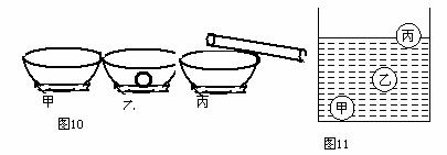 19.如图11所示,甲、乙、丙三个球体积相等,甲球沉在水底,乙球悬浮在水中,丙球漂浮在水面上,则它们所受的浮力( )