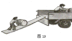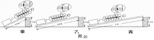 28、小明看到在没有起重机的情况下,工人要将油桶搬运上汽车,常常用如图19的方法.小明想:为什么不直接将油桶抬上车呢?难道这样做可以省力吗?如果能省力那么推力的大小与斜面长度有关吗?为了探究推力大小与斜面长度的关系,小明选用弹簧测力计、4N的重物和长分别为0.4m、0.8m、1m的木板进行了三次实验,每次斜面的高度均为 0.2m.测得沿斜面方向向上的拉力大小分别如下图20甲、乙、丙所示.(假设斜面很光滑,不计摩擦)