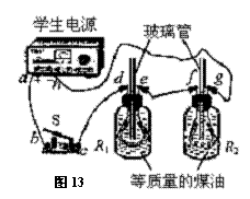 (16分) 图13所示是小明探究影响电流热效应的实验电路连接情况图,开关闭合一段时间后,他发现两瓶煤油中的液面都没有改变,小明断定电路中出现了断路,于是他用电压表开始检查断路位置。请回答有关他检查断路故障的问题:(说明:电源完好,电路只有一处断路故障。)