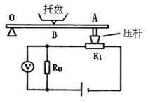 小雯设计了一个测量物体重力的“托盘秤”,如图是原理示意图,其中的托盘用来放置被测物体,OBA是可绕O点转动的杠杆,R1是压力传感器(其电阻值会随所受压力大小变化而变化,变化关系如下表),R0为定值电阻, 显示重力大小的仪表实质是一个量程为0-3V的电压表。已知OB:OA=1:2,R0=100Ω,电源电压恒为3V(忽略托盘、杠杆及压杆的重力)。 (2+3+3分)