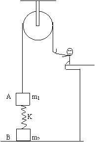 18.(12分)如图所示,质量为m1的物体A经一轻质弹簧与下方面上的质量为m2的物体B相连,弹簧的劲度系数为k,A、B都处于静止状态。一条不可伸长的轻绳绕过轻定滑轮,一端连物体A,另一端连一轻挂钩。开始时各段绳都处于伸直状态,A上方的一段绳子沿竖直方向。现在一小孩质量为m,抓住挂钩并由静止状态从平台上离开,已知小孩恰好能使B离开地面但不继续上升。若小孩换成大人质量为m1+m,仍从上述初始位置由静止状态离开,则这次B刚离开地时大人的速度大小是多少?已知重力加速度为g,小孩和大人的脚都不着地。