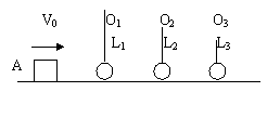 19.(16分)如图所示,滑块A的质量m=0.01kg,与水平地面间的动摩擦因数=0.2,用细线悬挂的小球质量均为m=0.01kg,沿轴排列,A与第1只小球及相邻两小球间距离均为,线长分别为L1、L2、L3…(图中只画三只小球,且小球可视为质点),开始时,滑块以速度沿轴正方向运动,设滑块与小球碰撞时不损失机械能,碰撞后小球均恰能在竖直平面内完成完整的圆周运动并再次与滑块A正碰,g取10m/s2,求: