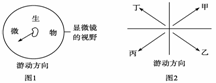 15.使用普通光学显微镜观察水中微生物,若发现视野中微生物如图1所示方向游走,请问应该把载玻片向图2所示的哪个方向移动